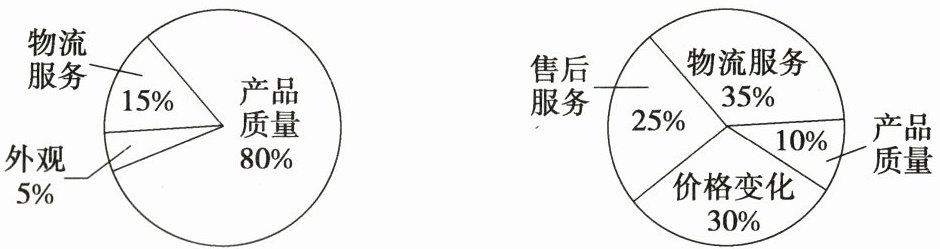(3)答案不唯一,如:建议王阿姨购买此产品。理由:①从左图中看出顾客的好评中有80%是对产品质量作出的好评。②右图中只有10%是对产品质量作出的中、差评,其余是对物流服务、售后服务和价格变化作出的中、差评。