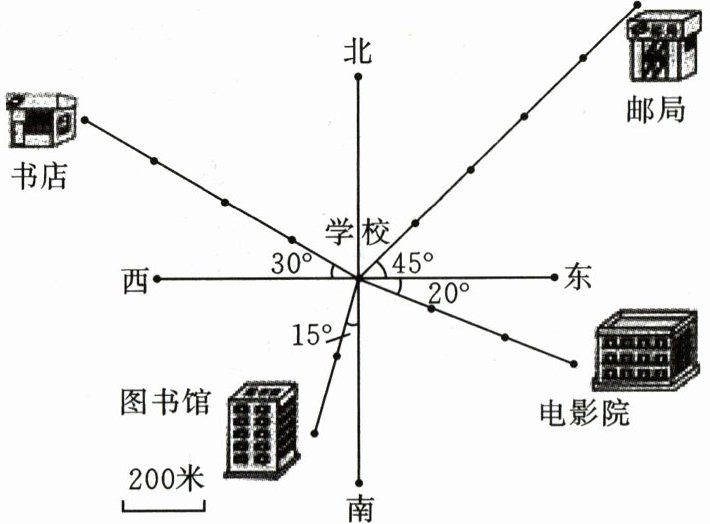(1) 少年宫在广场的东偏北 $ 35^{\circ} $ 方向上,距离是 $ 600 \, m $;