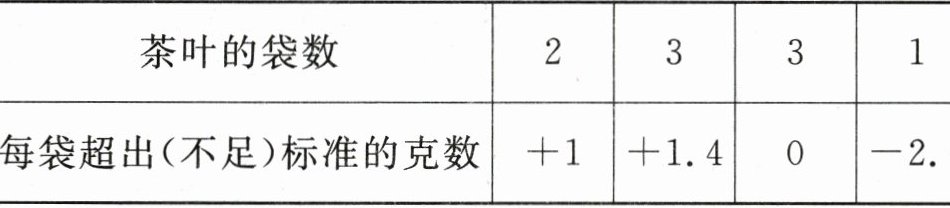 (2)2×1+3×1.4+3×0+1×(-2.6)+1×(-2)=2+4.2+0-2.6-2=1.6(g),500×10+1.6=5001.6(g).答:这10袋茶叶的总质量为5001.6g.