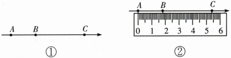 15. (新考法)如图①,点A,B,C是数轴上从左到右排列的三个点,表示的数分别为-3,$b$,6,某同学将刻度尺按如图②所示的方式放置,使刻度尺上的数字0对齐数轴上的点A,发现点B对齐刻度1.8cm,点C对齐刻度5.4cm,则数轴上点B所表示的数$b$为