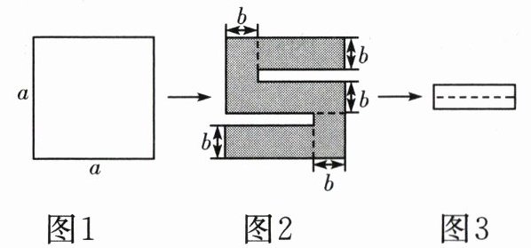 21.(8 分)从一个边长为 $a$ 的正方形纸片(如图 1)上剪去两个相同的小长方形,得到一个美术字“S”的图案(如图 2),再将剪下的两个小长方形拼成一个新长方形(如图 3).