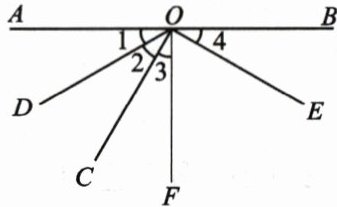 9. 如图,$∠1 = ∠2$,$∠3 = ∠4$,$∠AOF = \dfrac{1}{2}∠AOB = 90^{\circ}$,下列说法中正确的是(