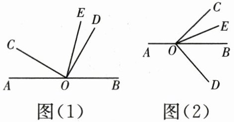 (2)如图(2)的位置关系,探究$∠AOC$与$∠DOE$之间的数量关系,直接写出你的结论。