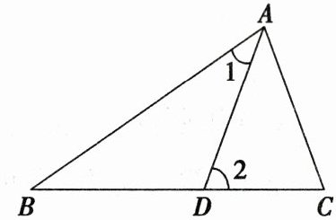 17. (6 分)如图,在 $ \triangle ABC $ 中,点 $ D $ 是 $ CB $ 上的一点,$ \angle 1 = \angle B $,$ \angle 2 = \angle C $,$ \angle BAC = 75^{\circ} $,求 $ \angle DAC $ 的度数。