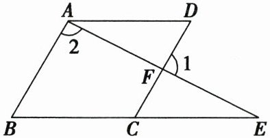 21. (8 分)如图,在四边形 $ ABCD $ 中,$ E $ 是 $ BC $ 延长线上的一点,连接 $ AE $ 交 $ CD $ 于点 $ F $。已知 $ \angle B = \angle D $,$ \angle 1 + \angle 2 = 180^{\circ} $。