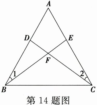 14. 如图,在$\triangle ABC$中,已知$\angle 1 = \angle 2$,$BE = CD$,$AB = 5$,$AE = 2$,则$CE = $