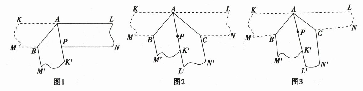 23. (11分)在数学探究活动中,小明找到一张两边平行的纸条,他先在边$KL上取一点A$,再在$MN边上任取一点P$,从点$A$处将纸条左侧折叠,使$AK折叠后的对应线段AK'经过点P$,此时的折痕记为$AB$(点$B在MN$上),如图1所示;再从点$A$处将纸条右侧折叠,使$AL折叠后的对应线段AL'也经过点P$,此时的折痕记为$AC$(点$C在MN$上),如图2所示.