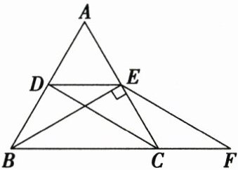20. (8 分)如图,在 $\triangle ABC$ 中,$AB = AC$,$BE \perp AC$ 于点 $E$,且 $D$,$E$ 分别是 $AB$,$AC$ 的中点,延长 $BC$ 至点 $F$,使 $CF = CE$。