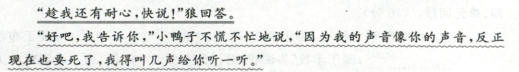 “你要吃了我吗,狼先生?”小鸭子说道,“我有一个请求,你可不可以等我说完再吃掉我?”