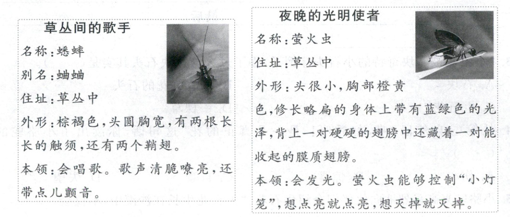 4. 从名片中我们知道蟋蟀被称为“草丛间的歌手”,是因为蟋蟀