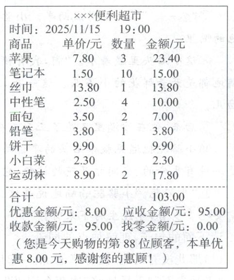 1. 103 95 亮亮和妈妈是当天购物的第 88位顾客,本单优惠了8元