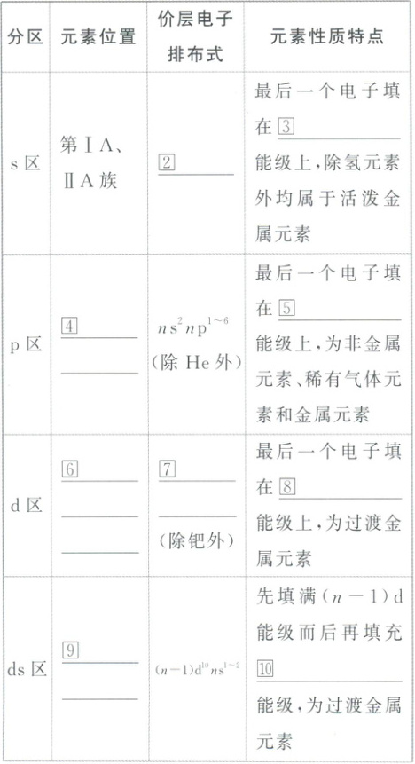 ①能级 ②$ns^{1~2}$ ③ns ④第ⅢA~ⅦA族、0族 ⑤np ⑥第ⅢB~Ⅷ族元素(除镧系、锕系外) ⑦$(n-1)d^{1~9}ns^{1~2}$ ⑧$(n-1)d$ ⑨第ⅠB、ⅡB族元素 ⑩ns ⑪B、Si、As、Te、At、Ts ⑫Al、Ge、Sb、Po、Lv ⑬右上角 ⑭左下角