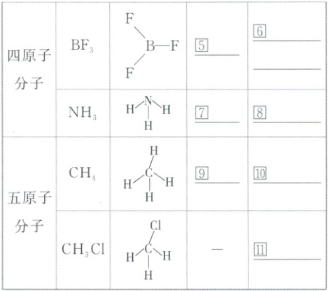 观察下列几种简单分子的空间结构模型,完成下表: