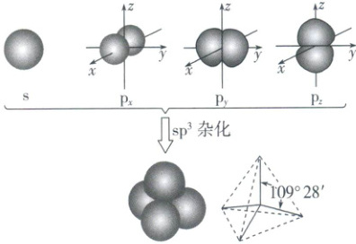 个$p$轨道杂化而得,每个$sp^3杂化轨道都含有\frac{1}{4}s轨道的成分和\frac{3}{4}p$轨道的成分,$sp^3$杂化轨道间的夹角为③$109^{\circ }28'$