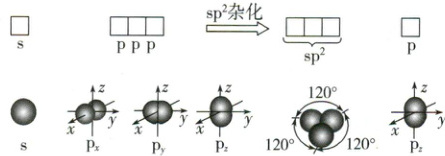 个$p$轨道杂化而得,每个$sp^2杂化轨道都含有\frac{1}{3}s轨道的成分和\frac{2}{3}p$轨道的成分,$sp^2$杂化轨道间的夹角为⑦$120^{\circ }$