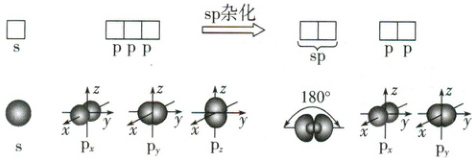 个$p$轨道杂化而得,每个$sp杂化轨道都含有\frac{1}{2}s轨道的成分和\frac{1}{2}p$轨道的成分,$sp$杂化轨道间的夹角为⑪$180^{\circ }$