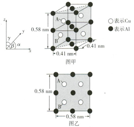 cm(阿伏加德罗常数的值为 $N_{A}$,不必化简列出表达式即可)。(3) 金属铜与铝可形成多种组成不同的合金,其中一种合金的晶胞如图甲所示,晶胞参数 $\alpha=\beta=\gamma = 90^{\circ}$,按图甲中阴影面进行投影得到图乙。