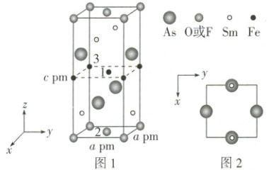 。(2) 一种四方结构的超导化合物的晶胞如图 1 所示。晶胞中 $Sm$ 和 $As$ 原子的投影位置如图 2 所示。