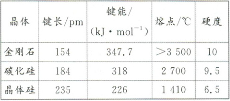 能。根据元素周期表,碳和硅为同主族元素,原子半径:C<Si,因此键长:C—C<C—Si<Si—Si,键能:C—C>C—Si>Si—Si,熔点和硬度:金刚石>碳化硅>晶体硅。