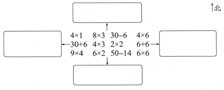2. 手拿算式卡片的同学们按照老师的指令,进行了现场展示。(得数是24的向北走,得数是4的向西走,得数是12的向东走,得数是36的向南走。请将算式写到相应的位置)