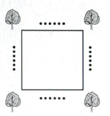 学校为了绿化校园,在实践基地四周等距离栽树(如图),每条边上都栽8棵树。请你算一算,一共栽了多少棵树?(用两种方法解答)