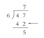 2. 运动会前,明明想帮老师把47名参加50米短跑的学生分组,按每6人一组,可以分成几组?还剩几人?明明列出的竖式如图,箭头所指的“42”表示(