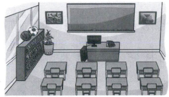 )面有篮球和足球。(3)第一排的课桌,从左到右依次是小佳、小方、小宇和小菲的,请你依次写上他们的名字。