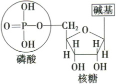 解析:选C。题图中物质含有磷酸、核糖和碱基,为核糖核苷酸,是组成RNA的基本单元,A项正确;核糖核苷酸的组成元素是C、H、O、N、P,B项正确;核糖核苷酸中不含胸腺嘧啶,C项错误;RNA参与遗传信息的传递过程,D项正确。