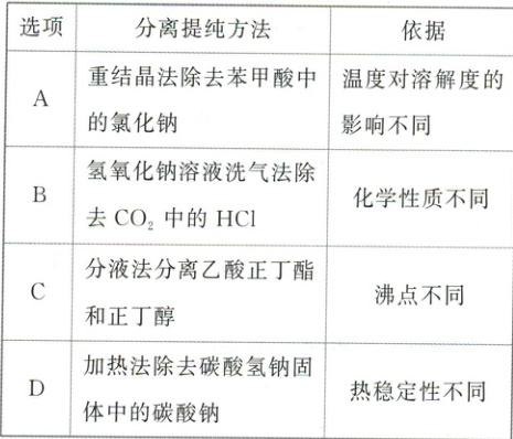 解析:选A。A.温度对苯甲酸、氯化钠的溶解度的影响不同,可以使用重结晶法除去苯甲酸中的氯化钠,A正确;B.二氧化碳和氯化氢都会被氢氧化钠溶液吸收,B错误;C.乙酸正丁酯和正丁醇互溶,不能通过分液法分离,应该使用蒸馏法分离,C错误;D.碳酸氢钠不稳定,受热易分解为碳酸钠、水和二氧化碳,加热使得碳酸氢钠转化为碳酸钠,故不可以使用加热法除去碳酸氢钠固体中的碳酸钠,D错误。
