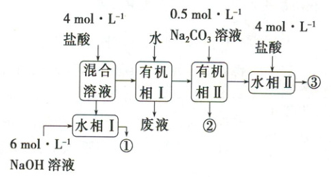 解析:选C。由题给流程可知,向甲苯、苯胺、苯甲酸的混合溶液中加入盐酸,盐酸将微溶于水的苯胺转化为易溶于水的苯胺盐酸盐,分液得到水相Ⅰ和有机相Ⅰ;向水相Ⅰ中加入氢氧化钠溶液将苯胺盐酸盐转化为苯胺,分液得到苯胺粗品①;向有机相Ⅰ中加入水洗涤除去混有的盐酸,分液得到废液和有机相Ⅱ,向有机相Ⅱ中加入碳酸钠溶液将微溶于水的苯甲酸转化为易溶于水的苯甲酸钠,分液得到甲苯粗品②和水相Ⅱ;向水相Ⅱ中加入盐酸,将苯甲酸钠转化为苯甲酸,经过结晶(或重结晶)、过滤、洗涤得到苯甲酸粗品③。苯胺分子中含有的氨基能与盐酸反应,但不能与氢氧化钠溶液反应,故A错误;由分析可知,得到苯胺粗品①的分离方法为分液,得到苯甲酸粗品③的分离方法为结晶(或重结晶)、过滤、洗涤,获取两者的操作方法不同,故B错误;由分析可知,苯胺、甲苯、苯甲酸粗品依次由①②③获得,故C正确;由分析可知,①②为液相,③为固相,都不是两相混合体系,故D错误。