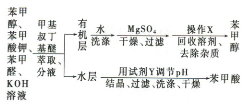 解析:选D。苯甲醛和KOH溶液反应后的混合液中主要是生成的苯甲醇和苯甲酸钾,加入甲基叔丁基醚萃取、分液后,苯甲醇留在有机层中,加水洗涤、加硫酸镁干燥、过滤,再用蒸馏的方法将苯甲醇分离出来;而萃取、分液后所得水层主要是苯甲酸钾,要加酸将其转化为苯甲酸,然后经过结晶、过滤、洗涤、干燥得到苯甲酸固体。A.“萃取”过程需振荡、放气、静置分层,故A正确。B.甲基叔丁基醚的密度为$0.74\ g·cm^{-3}$,密度比水小,所以要从分液漏斗上口倒出,故B正确。C.“操作X”是将苯甲醇从有机化合物中分离出来,可以利用沸点不同用蒸馏的方法将其分离出来;“试剂Y”的作用是将苯甲酸钾转化为苯甲酸,可选用盐酸,故C正确。D.苯甲酸在乙醇中的溶解度大于其在水中的溶解度,“洗涤”苯甲酸,用蒸馏水的效果比用乙醇好,故D错误。