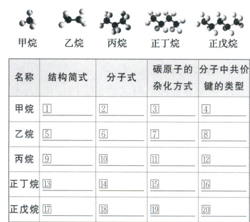 ①CH₄ ②CH₄ ③sp³ ④σ键 ⑤CH₃CH₃ ⑥C₂H₆ ⑦sp³ ⑧σ键 ⑨CH₃CH₂CH₃ ⑩C₃H₈ ⑪sp³ ⑫σ键 ⑬CH₃(CH₂)₂CH₃ ⑭C₄H₁₀ ⑮sp³ ⑯σ键 ⑰CH₃(CH₂)₃CH₃ ⑱C₅H₁₂ ⑲sp³ ⑳σ键 ㉑sp³ ㉒sp³ ㉓碳原子 ㉔氢原子 ㉕σ ㉖碳 ㉗锯齿状 ㉘单键 ㉙CₙH₂ₙ₊₂