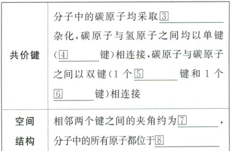 ①碳碳双键 ②${C_{n}H_{2n}}$ ③${sp^{2}}$ ④$\sigma$ ⑤$\sigma$ ⑥$\pi$ ⑦$120^{\circ}$ ⑧同一平面 ⑨${sp^{2}}$ ⑩${sp^{3}}$ ⑪一个平面内
