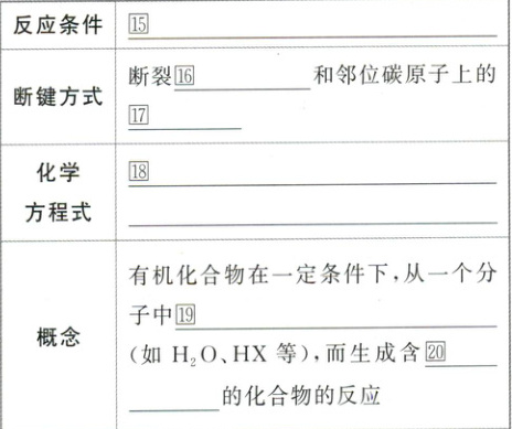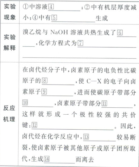 ④分层⑤浅黄色沉淀⑥Br⁻⑦CH₃CH₂Br + NaOH$\xrightarrow[\triangle ]{水}$CH₃CH₂OH + NaBr⑧大⑨偏移⑩正电荷(δ⁺)⑪负电荷(δ⁻)⑫C⁺-X⁻⑬C-X⑭负离子⑮强碱(如NaOH或KOH)的乙醇溶液、加热⑯C-X⑰C-H⑱CH₃CH₂Br + NaOH$\xrightarrow[\triangle ]{乙醇}$CH₂=CH₂↑ + NaBr + H₂O⑲脱去一个或几个小分子⑳不饱和键
