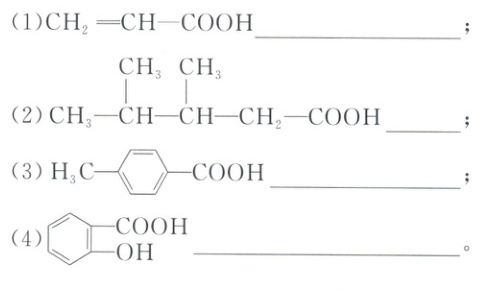 (1)丙烯酸 (2)3,4-二甲基戊酸 (3)对甲基苯甲酸 (4)邻羟基苯甲酸
