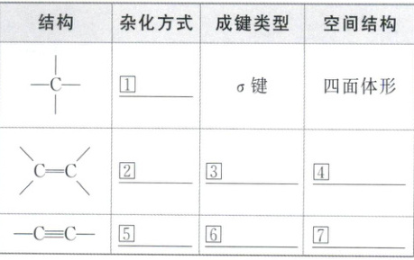 ①${sp^3}$ ②${sp^2}$ ③σ键、π键 ④平面形 ⑤${sp}$ ⑥σ键、π键 ⑦直线形
