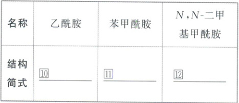 ⑤羟基 ⑥氨基 ⑦${R - C - NH_{2}}$ ⑧${R - C - }$ ⑨${ - C - NH_{2}}$ ⑩${CH_{3} - C - NH_{2}}$ ⑪${ - C - NH_{2}}$ ⑬${RCONH_{2} + H_{2}O + HCl\xrightarrow{\triangle}RCOOH + NH_{4}Cl}$ ⑭${RCONH_{2} + NaOH\xrightarrow{\triangle}RCOONa + NH_{3}\uparrow}$