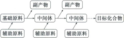 有机合成过程是基础原料经中间体(需辅助原料,产生副产物)多步转化得到目标化合物的过程。