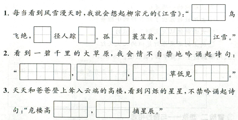 1. 千山 万 灭 舟 独钓寒 2. 天苍苍 野茫茫 风吹 牛羊 3. 百尺 手可