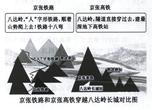 [材料] 我国自行设计的“京张高铁”已全线开通运营,其中穿越八达岭长城段建成了世界最深高铁站,震惊于世!而位于其上方的则是建于一百多年前的京张铁路,京张铁路最出名的莫过于“人”字形设计,以解决铁路直接通过大坡度的问题(如图),火车采用两个车头,一头拉,一头推,解决了大坡度单车头动力不足的问题,到达青龙桥站后停车,火车反方向继续爬升。对比之下,京张高铁首次采用北斗卫星导航系统(我国自主设计),实现了有人值守的无人驾驶,不需要司机操作,就能实现列车自主运行。由于地形特殊,既要考虑高铁线路笔直和平坦,又必须在八达岭处设站。工程师们大胆地采用了地下高铁站,于是地下约 100 m 深的高铁站横空出世。