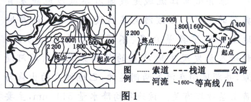 [材料] 暑假期间,某研学小组前往成都西岭雪山开展地貌野外考察。同学们到达游客中心后,发现有索道、步行栈道和公路等上山路径。同学们选择沿栈道拾级而上,穿行于盛夏的林海中,考察当地地貌,再沿公路返回。图 1 为西岭雪山部分地区等高线地形图。