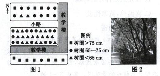 [材料] 北京某学校学生在校园展开植被综合实践活动。该校园的梧桐树为同批次栽种,同学对该校三片梧桐树生长状况开展探究,以树围作为植株生长状况的主要指标。同学用皮尺在相同高度对校内梧桐树的树围进行了测量,并分类整理(图 1)。图 2 为校园梧桐树景观照片。