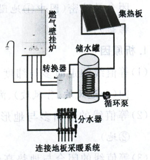 材料:我国太阳能资源丰富,太阳能供暖技术有很好的发展前景。某太阳能供暖系统(太阳能、燃气互补)是对太阳能的新型利用方式,其工作原理是将太阳能转化为热能,把水加热,给室内供暖,通常该系统还包括燃气壁挂炉。如图示意该太阳能供暖系统。