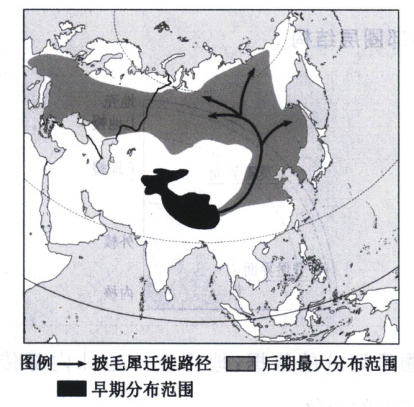 [材料] 2011 年,中国科学院学者在青藏高原发现了目前已发现最原始的披毛犀化石(距今约 370 万年)。披毛犀为大型食草动物,全身披毛,适应寒冷环境。其长达 1 m 的鼻角可以刮开冰雪,找到干草。伴随着青藏高原不断隆起以及第四纪(260 万年前至今)气候变化,披毛犀的活动位置发生过两次大迁徙(如图),第一次是由青藏高原逐渐向我国华北、东北地区迁徙,第二次是由我国华北、东北地区北迁至西伯利亚,并最终在距今约 1 万年前的新石器时期灭绝。近年来,有关学者在西伯利亚地区永久冻土层发掘出多具完整披毛犀遗体。