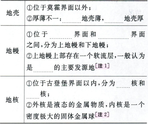 |地核|①位于古登堡界面以内,分为**外**核和**内**核;②外核是液态的金属物质,内核是一个密度极大的固体金属球|