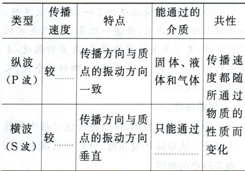 |纵波(P波)|**快**|传播方向与质点的振动方向一致|固体、液体和气体|传播速度都随所通过物质的性质而变化|