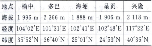 目前,世界公认的平原运动员进行高原训练的最佳高度为 $1\,800—2\,400$ m。我国已建成甘肃榆中、青海多巴、云南海埂与呈贡、河北兴隆等国家级高原体育训练基地。下表示意我国部分高原体育训练基地的地理坐标及海拔。