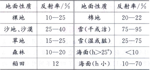 投射到地面的太阳辐射,并非完全被地面吸收,其中一小部分被地面反射。反射部分的辐射量占总辐射量的百分比,称为反射率。地面性质不同,反射率差别很大(如表所示)。显然,反射率越大,吸收越少。尽管总辐射相同,但地表吸收并不相等,这是导致近地面温度分布不均匀的原因之一。