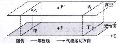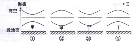 (环流模式箭头:近地面乙→甲,高空丁→丙,垂直方向甲处向上箭头,乙处向下箭头,形成顺时针环流)(高空等压面:丁处向上凸,丙处向下凹)