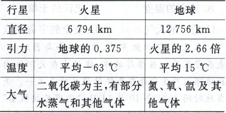 2021 年 5 月,携带着“祝融号”火星车的“天问一号”探测器成功登陆火星,在火星表面开展多项科学探测任务。下表为该同学收集的关于火星和地球的部分数据资料。